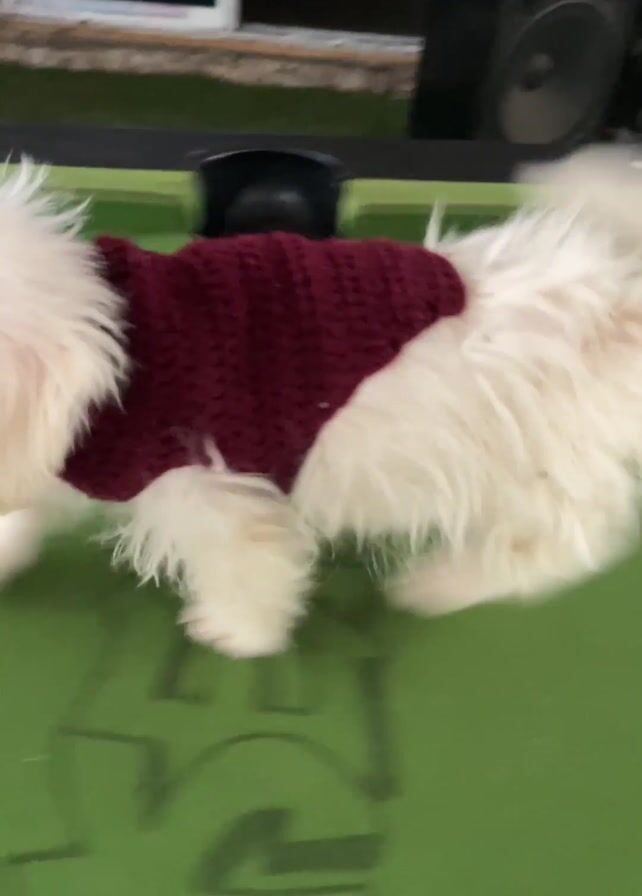 A white Maltese dog, wearing a burgundy sweater, runs around on a green pool table. The dog sniffs the edge of the table near a corner pocket. The room is well-lit, and the video is a little shaky.