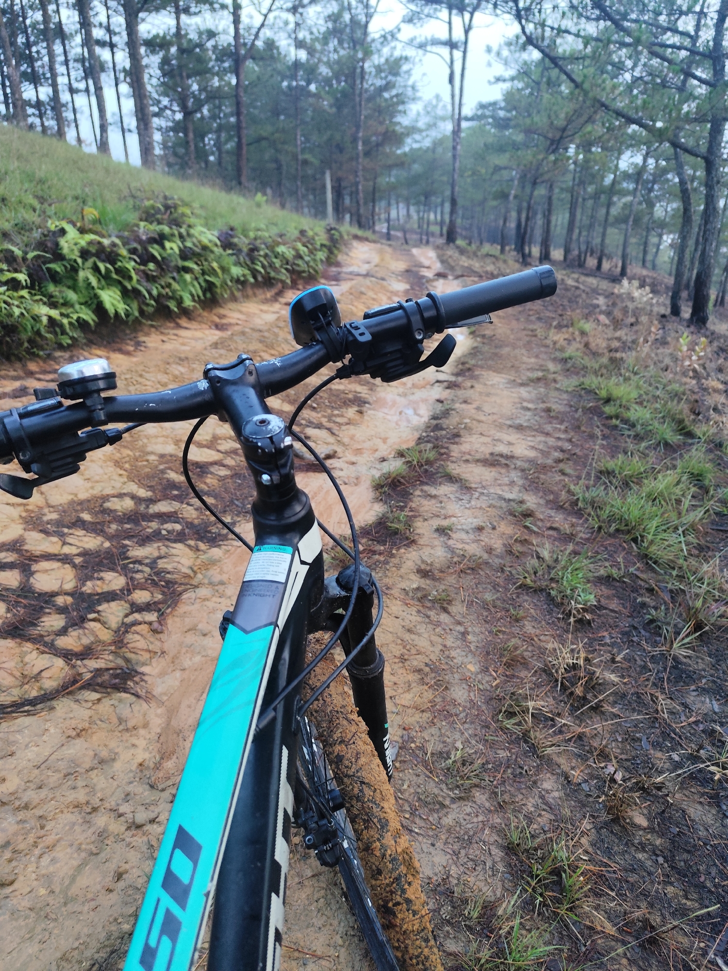 perspective of a person riding a mountain bike on a muddy trail in Lam Vien - Da Lat, Vietnam