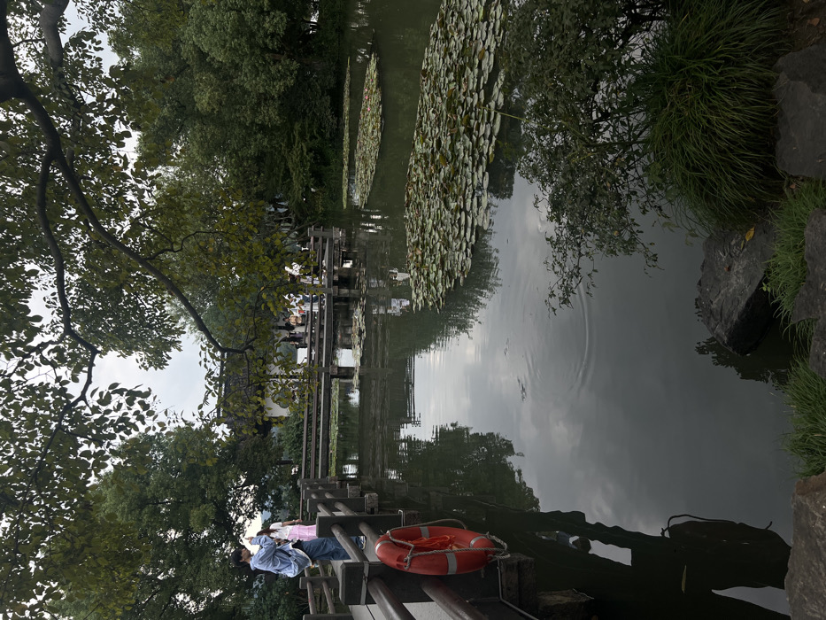 The image depicts a traditional Chinese garden scene in the Xihu District, Hangzhou, China, likely within the West Lake Scenic Area. A dark, calm body of water occupies the central and lower frame, reflecting an overcast sky and surrounding green foliage. The water surface is extensively covered by clusters of green lily pads with scattered small pink lotus flowers. In the mid-ground, two dark wooden bridges with railings traverse the water. On the nearest bridge, a male individual in a light blue jacket and jeans stands with his back mostly to the viewer, holding a white smartphone to capture the scene. A red and white life preserver hangs from the bridge railing on the left. Further back, on a second wooden bridge, approximately 5-7 individuals are visible standing or walking. Behind this distant bridge, traditional Chinese architecture with white walls and dark roofs is discernible, nestled among dense green trees that line the water's edge. Additional green trees and branches frame the upper perimeter of the image, while dark rocks and ground foliage mark the immediate foreground on the right.