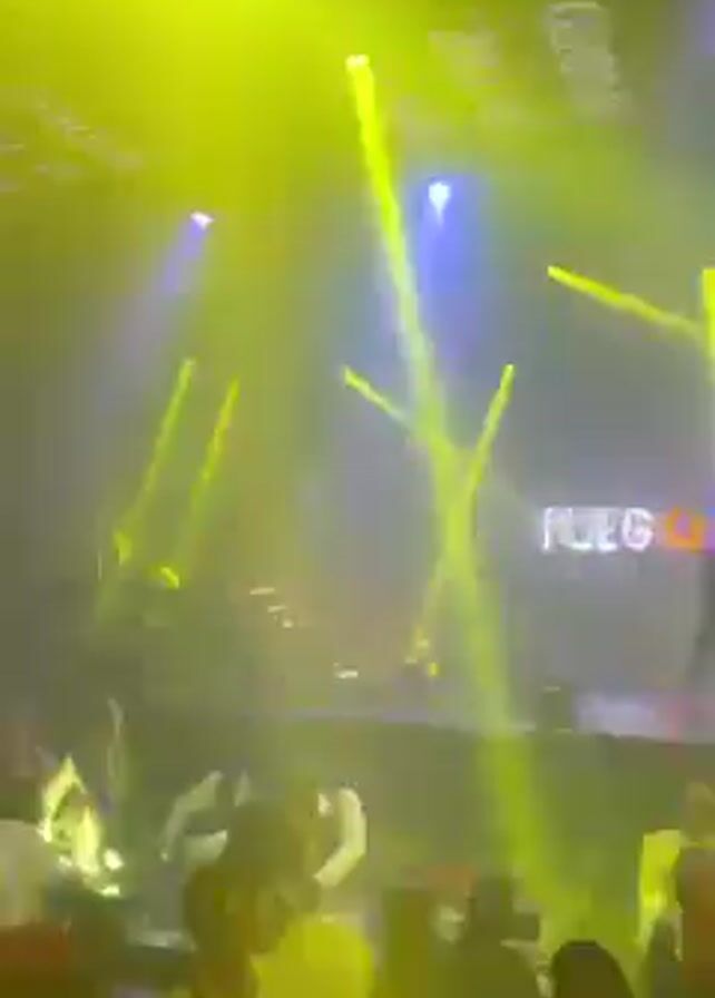 crowded nightclub. On a raised platform, a DJ is performing under a large screen displaying the word "FUEGO" in bright letters. Spotlights and other lights flash in yellow and blue, creating a dynamic atmosphere. The crowd is mostly composed of people standing and moving, likely dancing and enjoying the music. Some are facing the stage, while others are turned away. A few people are holding balloons.