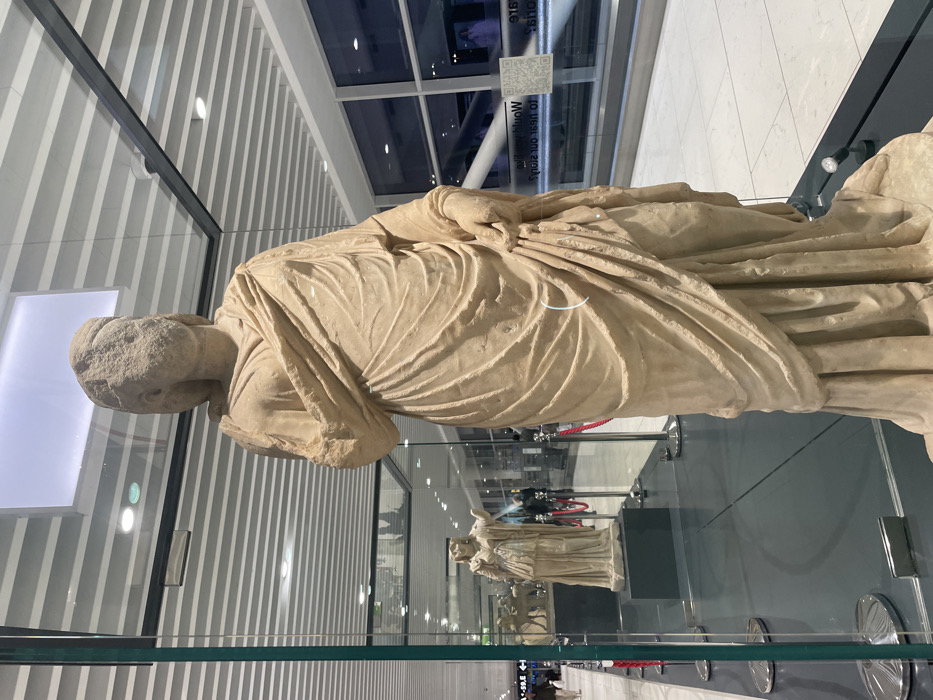A weathered, stone sculpture of a draped figure dominates the foreground. The figure is mostly complete and stands within a glass enclosure. The background reveals a modern building interior with a series of glass windows, steel supports, and polished floors. Smaller, similar sculptures are visible further down the display line. Overhead lighting is bright and reflects off the surfaces. The sculptures are arranged within a museum or gallery setting.