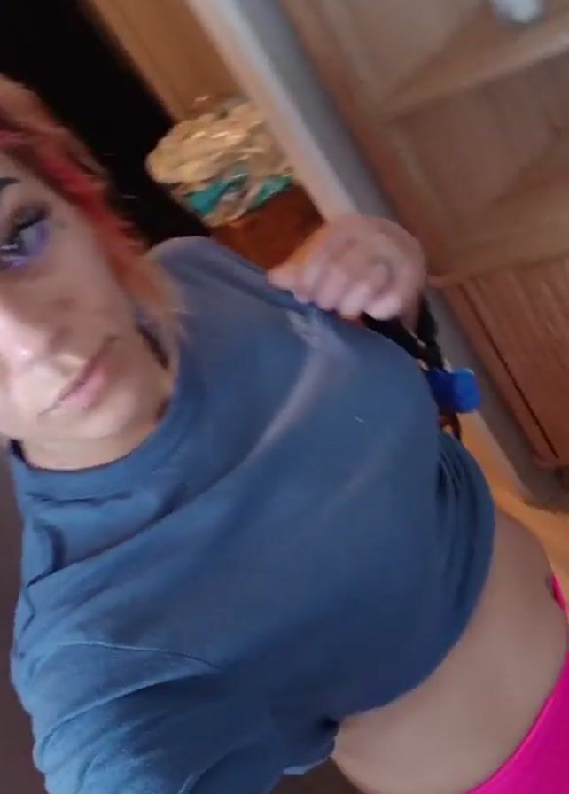 person with pink and red hair, wearing a blue shirt and pink leggings, moving around a room. The person's appearance includes bold eyebrows and long eyelashes. The camera follows the person's movements, capturing different angles, including close-ups of the person's midriff and backside. The background includes a wooden shelf with items on it, a door, and other objects within the room.