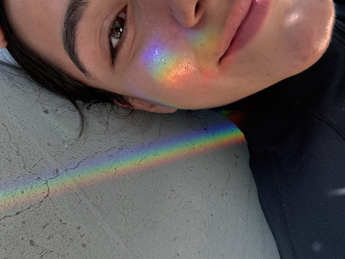 A close-up, angled photograph captures a female-presenting individual's face, positioned horizontally, with her head resting on a light gray concrete surface. Her dark hair is visible near her head. Her right eye is open and appears to be looking towards the viewer, while her lips are slightly parted. She is wearing a dark, possibly black, garment visible on the right side of the frame. A vivid, multi-colored rainbow spectrum of light is projected across her left cheekbone, extending diagonally downwards across the textured concrete surface towards the lower-left corner of the image. The concrete surface displays minor cracks and imperfections. No specific identifying features are present in the image to determine a precise location within Puebla City, Mexico.