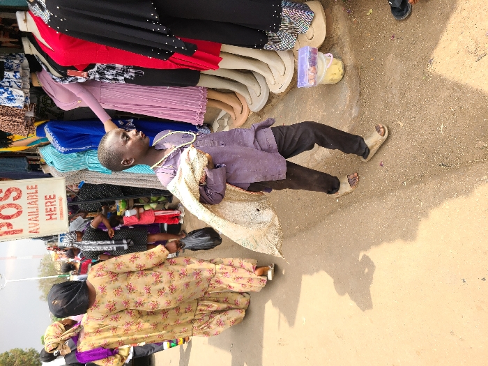An outdoor market scene in Jos, Nigeria, under bright daylight. In the foreground, a young boy, approximately 8-12 years old, walks from right to left. He wears a dark purple tunic, dark trousers, and light-colored sandals, carrying a cream-colored, patterned fabric draped over his left arm and shoulder, and a thin yellow necklace. To his left, two adult women walk away from the camera, both wearing long patterned dresses and head coverings; the closer woman carries a black plastic bag. On the right, a row of mannequins displays various garments, including a light blue shirt, a royal blue dress, a pink pleated dress, a red dress, and a black abaya. A white sign with red lettering reading "POS AVAILABLE HERE" is mounted above the merchandise. Below the mannequins, a clear plastic container with a purple lid, holding small colorful items, rests on a white bucket. The ground is an unpaved, dusty surface with visible shadows. Additional pedestrians and market stalls are visible in the background.