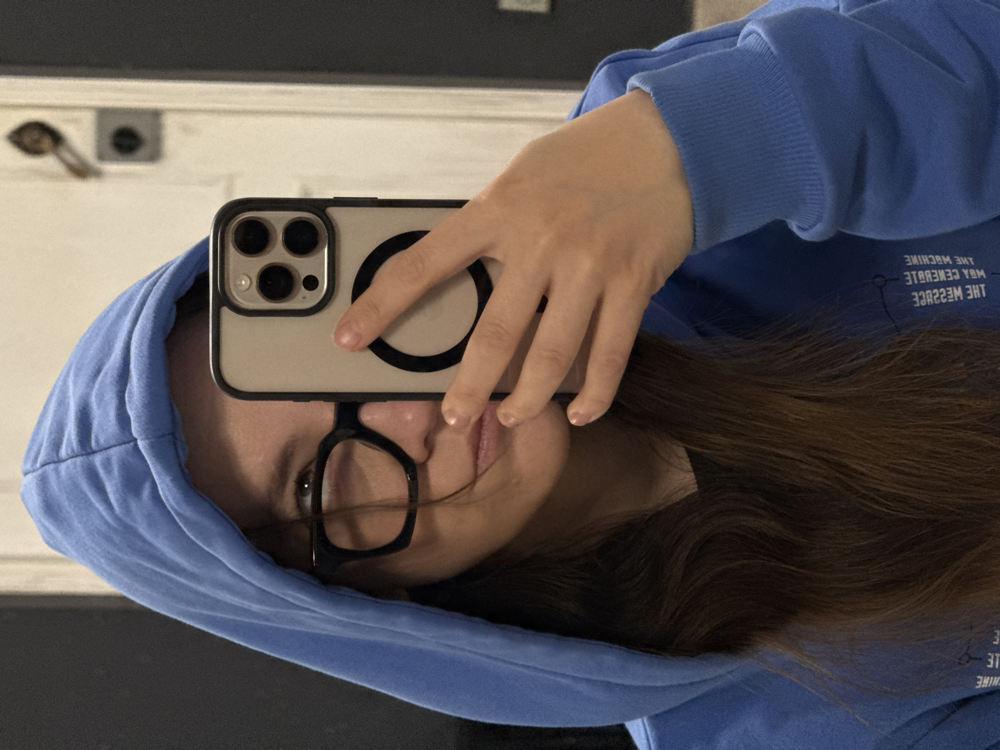 A person is taking a selfie with a smartphone. The phone is positioned in front of their face, partially obscuring their features. The person is wearing a blue hooded sweatshirt and eyeglasses. Part of a wall or door is visible in the upper left corner of the frame. It is not possible to confirm the location is Chaikovsky, Russia, from the image.