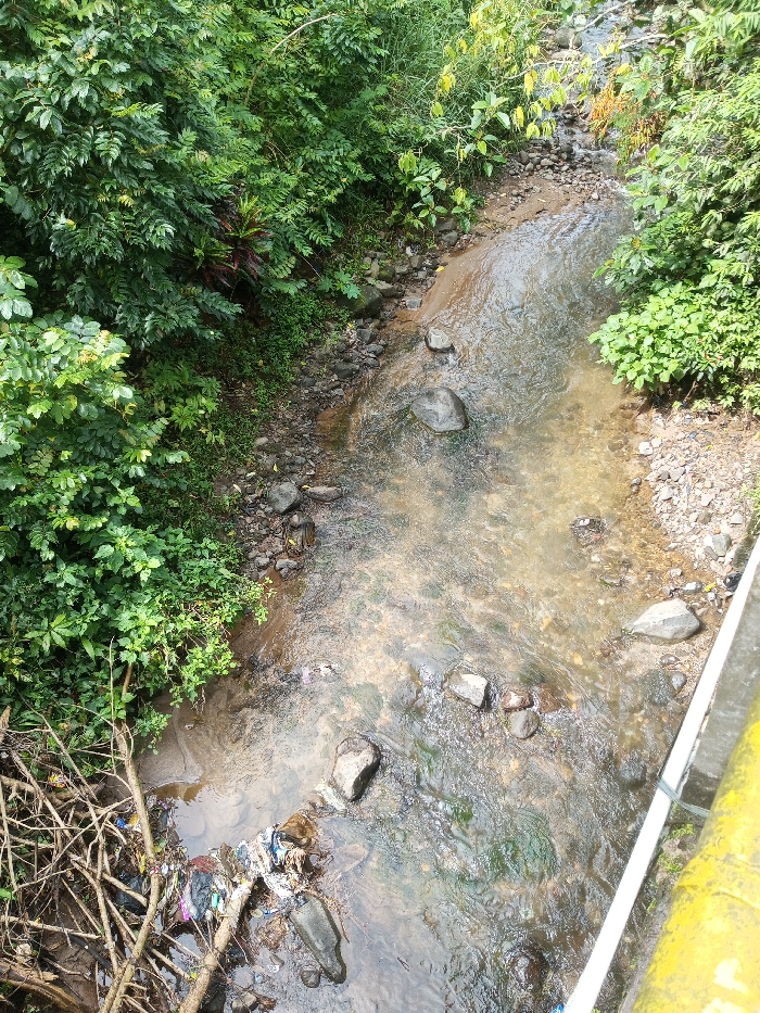 A stream flows between lush green vegetation on either side. Rocky banks lead down to the shallow, clear water. Debris, including plastic and branches, is visible on the left bank near the water's edge. A structure, possibly a bridge railing, with a yellow-painted section, appears on the right side. The stream bed is visible through the water, showing various-sized rocks.