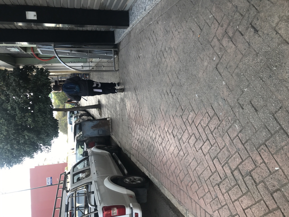 This image captures a street scene in Meknes, Morocco, during daylight hours. A male individual, viewed from behind, walks away from the camera on a reddish-brown brick sidewalk paved in a herringbone pattern. He wears a dark hooded jacket, dark pants featuring a large white '17' graphic on the left leg, and dark shoes, carrying a blue backpack and a slender object in his right hand. To the left of the sidewalk, a white pickup truck with a black metal bed rack is parked along the curb, facing away from the camera. Several other cars are parked in a line behind it. A distressed, dark A-frame sign stands on the sidewalk adjacent to the parked vehicles. In the background on the left, a multi-story building with a distinctive red facade is visible. On the right side of the sidewalk, a commercial building features dark vertical pillars at its entrance, a closed gray roll-down shutter, and an open silver metal gate leaning against the exterior wall. A tree with dense green foliage grows from the sidewalk near the center of the frame, casting partial shadows. The street beyond the parked vehicles appears to be asphalt.