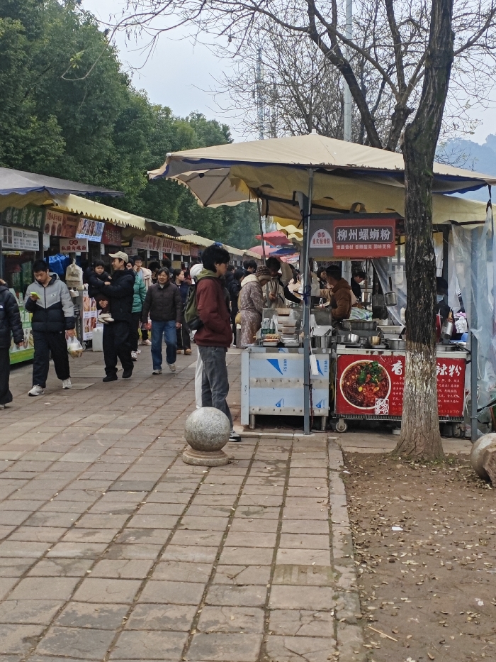 A bustling outdoor market scene unfolds on a brick-paved path lined with food stalls under tan canopies. Customers gather, some ordering food, while vendors prepare meals. A variety of Chinese dishes are advertised on the stalls. A decorative stone sphere sits on the path's edge, separating the walkway from a patch of bare earth with fallen leaves, alongside a tree. People stroll casually through the market.