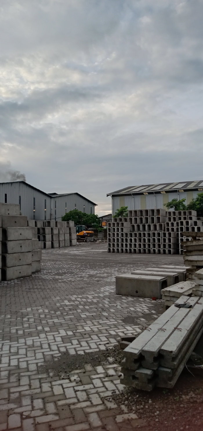 This image depicts an industrial yard in Sumput, Indonesia, under an overcast sky. The foreground and mid-ground consist of a paved area made of light-colored interlocking bricks, interspersed with patches of gravel and dirt. Various concrete elements are stacked throughout the scene. On the left, a tall stack of light gray, rectangular concrete blocks with recessed sections is visible. Further into the mid-ground, another large quantity of U-shaped concrete channels is neatly stacked in rows, forming a significant barrier. In the far right foreground, a stack of long, H-beam-like concrete elements with rebar protruding is present. Two individual U-shaped concrete blocks are situated in the mid-right. In the background, two large industrial buildings with corrugated metal roofs are visible. The building on the left, with vertical windows or vents, has dark smoke emanating from its far-left side, rising against the sky. Between the two main stacks of concrete channels, a yellow excavator is stationary, partially obscured by other stacked concrete elements and some green foliage. No people are visible within the frame. The overall atmosphere is industrial and quiet.