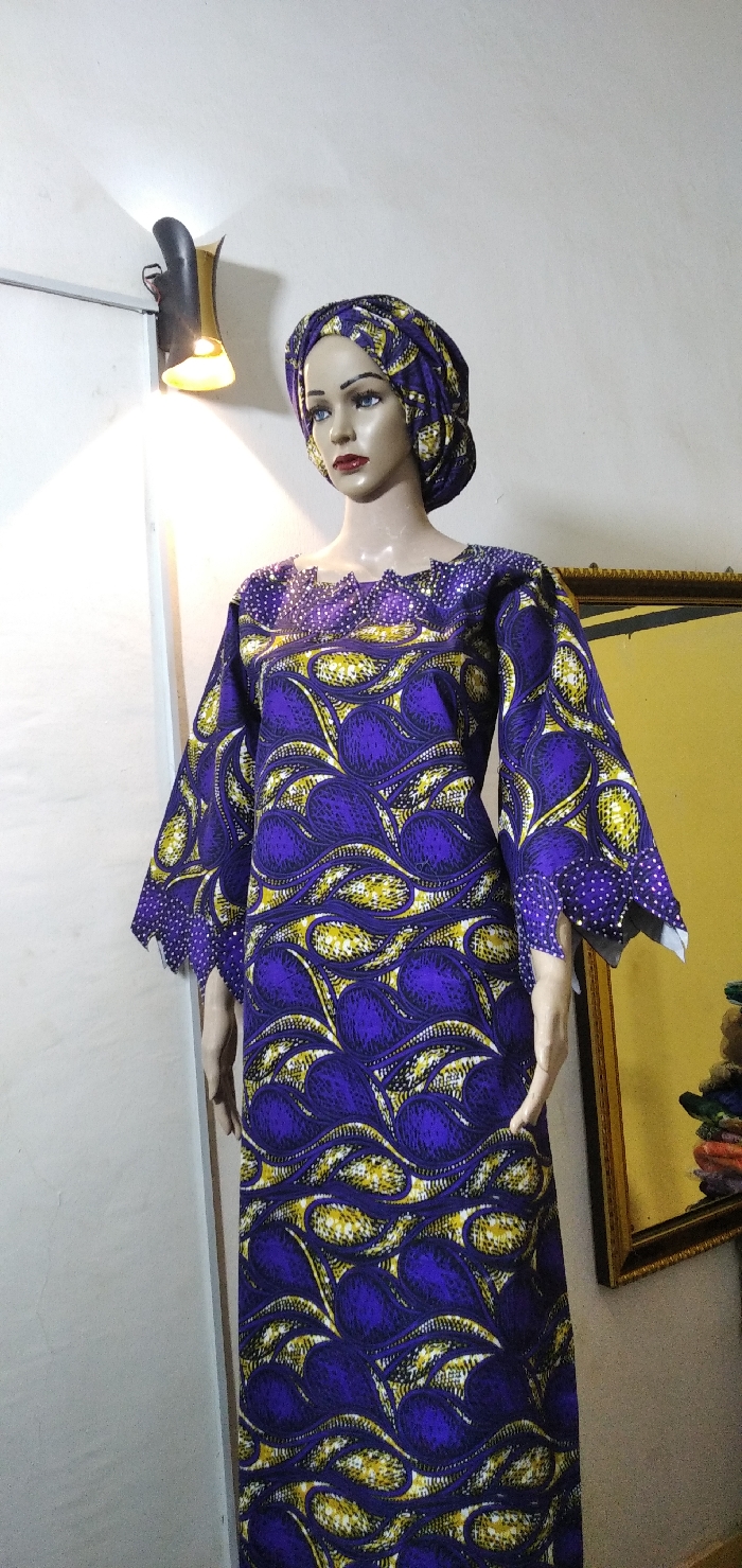 A mannequin wears a purple and yellow patterned dress with matching head wrap
