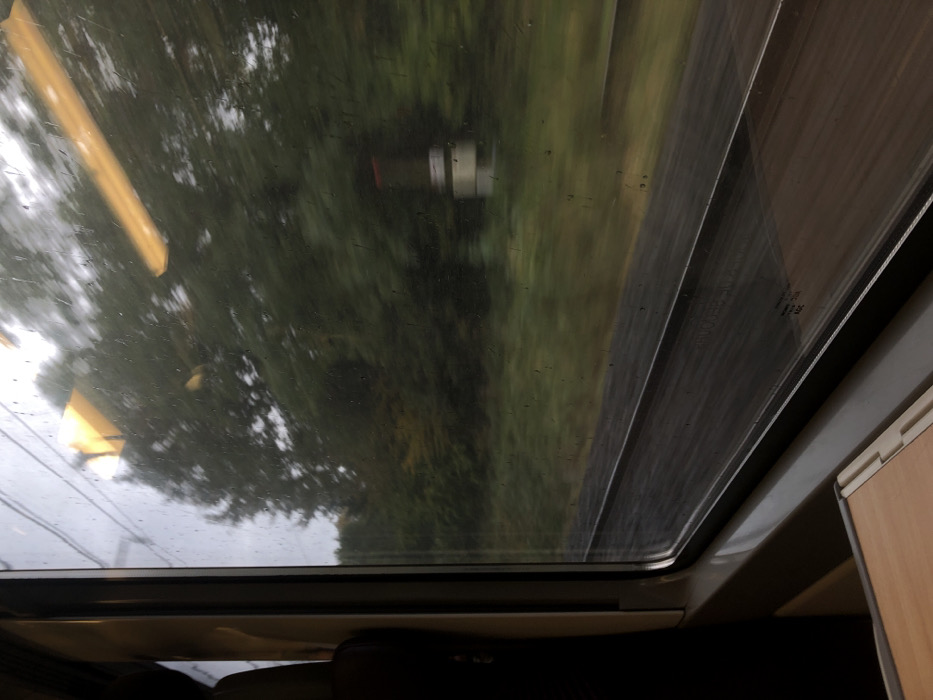 The scene depicts a view from the interior of a moving train, in the vicinity of Hochfelden, France. The image is captured through a window covered in small raindrops, suggesting precipitation. Inside the train, a partial view of a dark, upholstered passenger seat is visible on the far left. Below the window, a light-colored, rectangular fold-down tray table is observed. Outside the train, two parallel railway tracks, blurred by motion, traverse the lower section of the frame. Above the tracks, a dense expanse of green trees and foliage, also exhibiting motion blur, stretches across the mid-ground. A light-colored pole, topped with a reddish-orange section, is partially visible through the blurred trees on the right side. The sky above the tree line is uniformly overcast and grey. Two elongated yellow light reflections are present on the upper interior surface of the window. No individuals are visible in the frame.