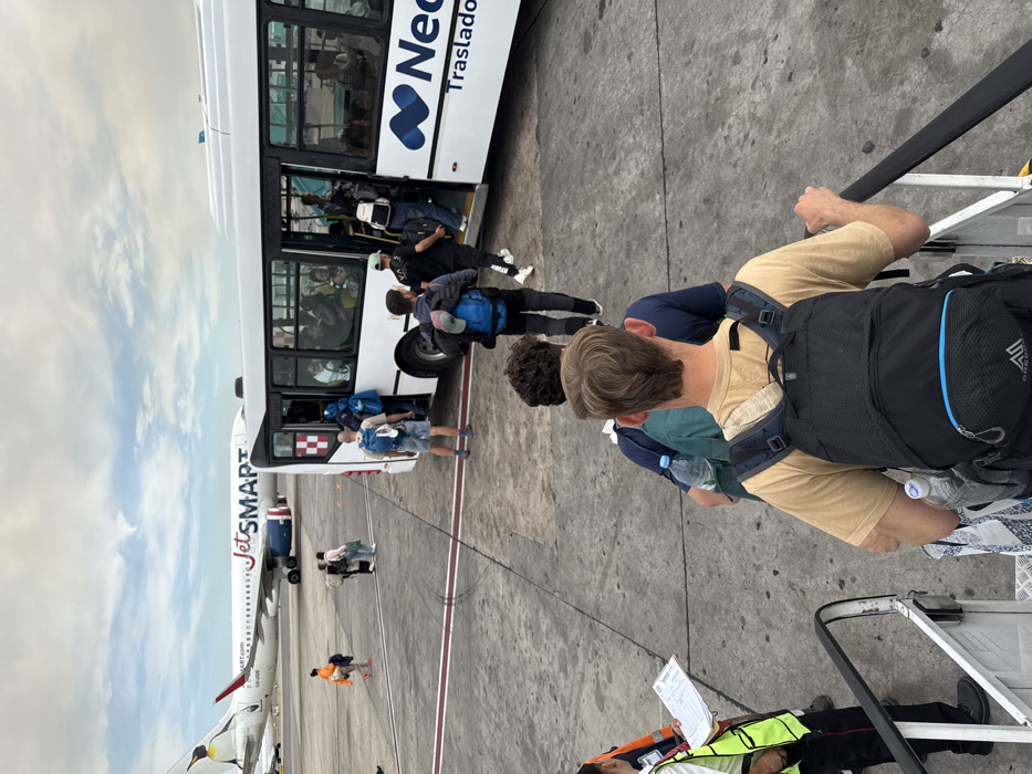Passengers disembark a bus branded "Neo Traslado" near a JetSMART plane at an airport. People carry backpacks and bags. A worker with a clipboard and reflective vest stands at the base of stairs leading to the plane. The sky is overcast. The image has been rotated, as the plane and people are sideways.