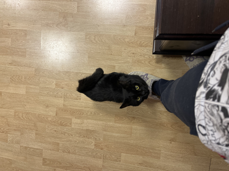 The image depicts an indoor domestic scene within the city of Kyiv, Ukraine. A short-haired black cat with prominent yellow-green eyes is positioned in the mid-ground, facing upwards towards the camera. Its front paws rest on the top of a light-colored, possibly grey, patterned slipper worn on a human's left foot. The human's leg, clad in dark blue trousers, extends upwards from the slipper, and the lower torso, covered by white and black patterned fabric, is visible at the bottom of the frame. The cat's tail is partially curled and visible behind its body. The floor is covered with light brown laminate or wood-patterned flooring. A dark brown wooden object, possibly a piece of furniture such as a cabinet or table leg, is partially visible in the lower right corner of the frame.