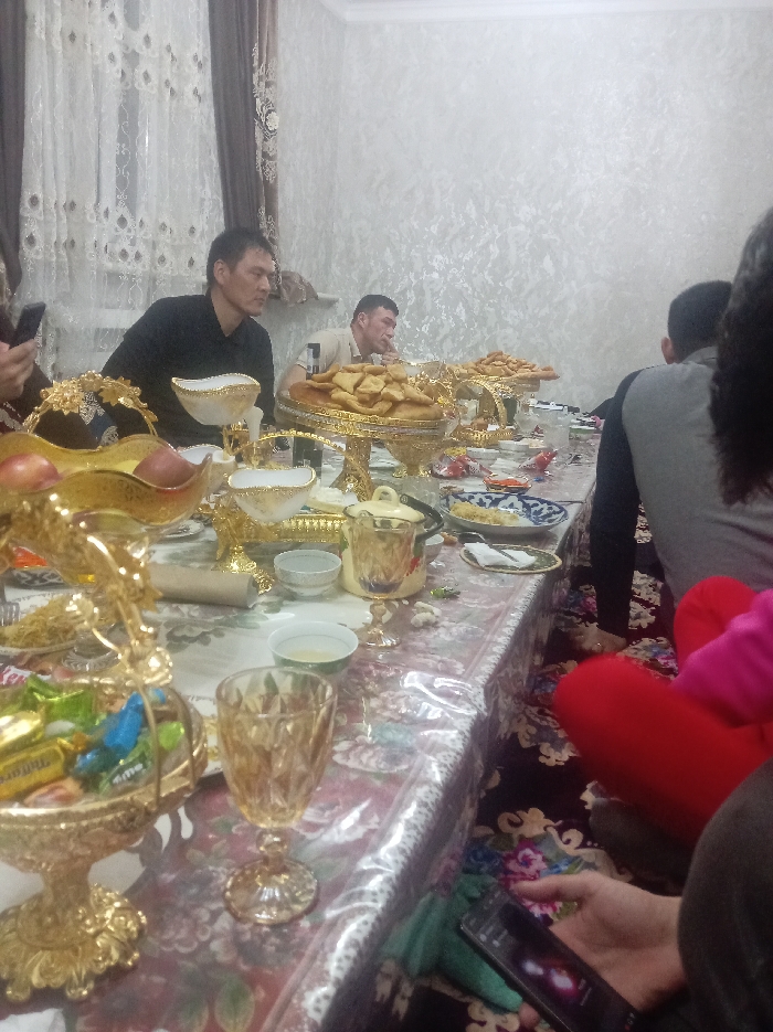 A group sits around a table laden with food. Two men are visible on one side; one wears a black shirt, the other a light-colored shirt. Golden serving dishes overflow with pastries and fruits. Plates and bowls are arranged along the table's center. People sit on the floor, legs crossed, on a patterned rug. Someone is holding a phone in the foreground. Heavy curtains hang in the background.