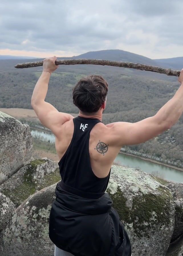 A man stands atop a rocky outcrop with a scenic landscape in the background. He is facing away from the camera, wearing a black tank top, striped pants, and a black jacket tied around his waist. The tank top has the letters "HF" printed on the back, and he has a compass tattoo on his right shoulder. He holds a wooden stick overhead, arms raised, and then lowers it, turning his head to the right to smile at something unseen. The environment includes a river, rolling hills covered with trees, and a cloudy sky. The rocky surface is covered in patches of moss.