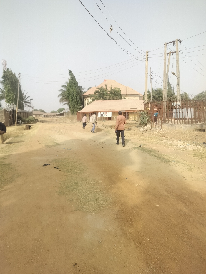 This image depicts a dusty, unpaved dirt road in Sabon Tasha, Nigeria, under a hazy, light-colored sky