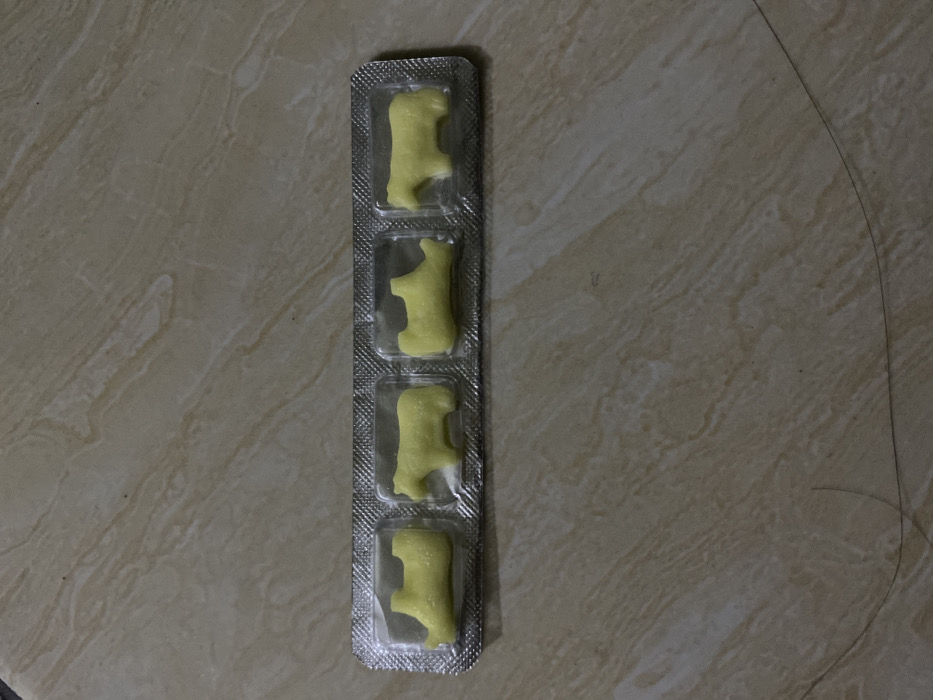 A blister pack containing four distinct yellow, molded objects is horizontally centered on a light beige tiled surface