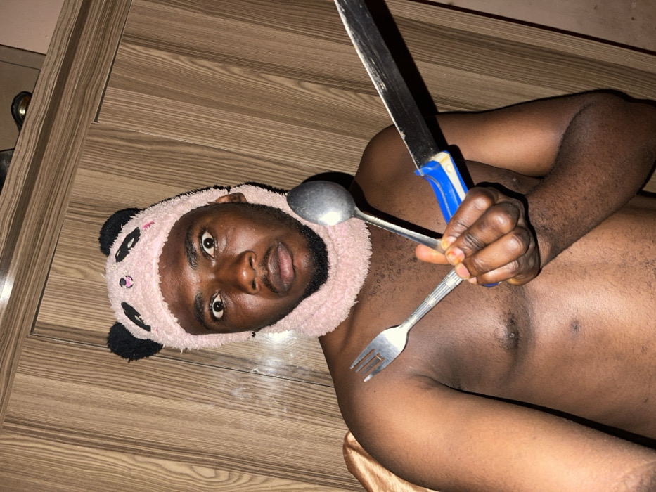 In Muchiya, Nigeria, an adult male with dark skin and a beard is depicted shirtless. He is wearing a pink plush balaclava designed to resemble a panda head, featuring black ears and embroidered facial details. His eyes are wide open, and his mouth is slightly agape. In his right hand, he holds three items: a silver four-tine fork, a silver tablespoon, and a large kitchen knife with a blue and white plastic handle. The fork is held in front, with the spoon behind it, and the knife is positioned behind both, angled upwards and to the right. The background consists of vertical light brown wood-grain paneling. A small section of light brown fabric is visible behind his left shoulder on the left side of the frame.