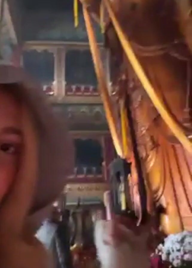 A fair-skinned woman with blonde hair is recording a close-up video of herself. She is wearing a hooded sweatshirt, pulled up over her head. In the background, a large, golden Buddha statue is visible. The woman states that it is the largest Buddha in the world, made from one piece of oak.
