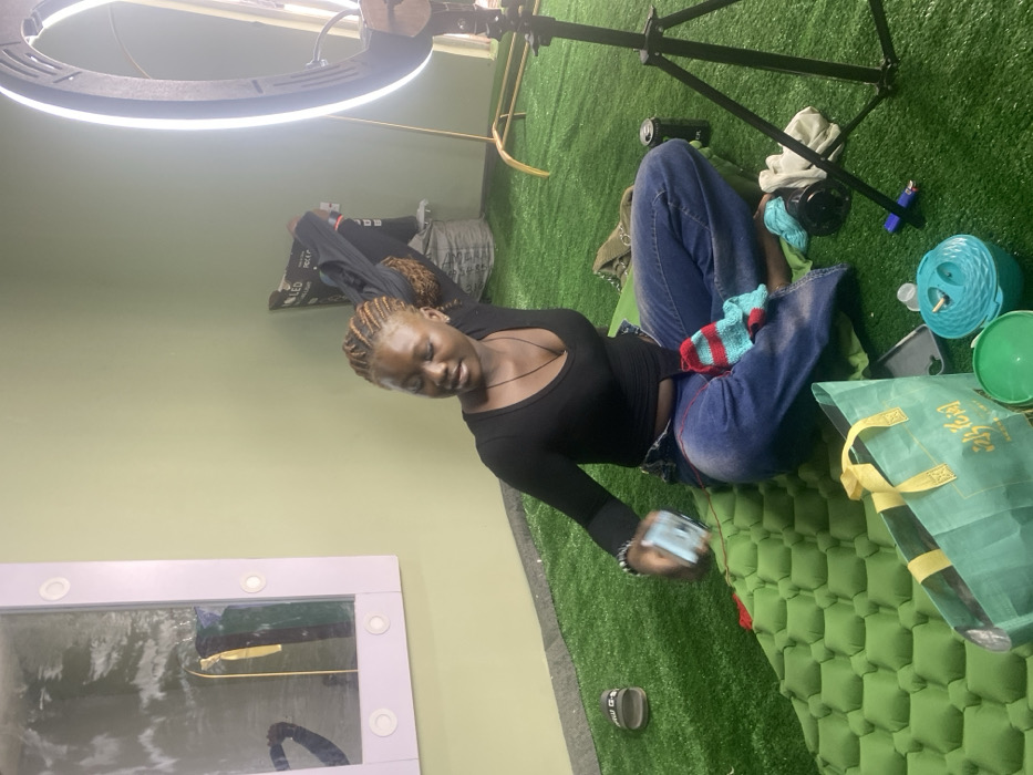 A woman with braided hair is seated on a green, textured surface. She wears a black long-sleeved shirt and jeans, holding a small blue object. A green shopping bag and a blue and green toy sit near her. A ring light and a tripod stand above her. A makeup mirror is visible in the background, reflecting the scene. Pillows and clothing are scattered nearby, suggesting a casual or cluttered environment.
