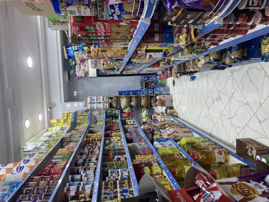 A bustling supermarket interior is shown, featuring aisles overflowing with diverse products on shelves. The shelves are densely packed with items ranging from snacks and biscuits to cooking oil and household goods. The tile floor is clean and white with a marble pattern. Fluorescent lights illuminate the space. A surveillance camera is mounted on the wall. The depth of field emphasizes the rows of products stretching toward the back of the store.