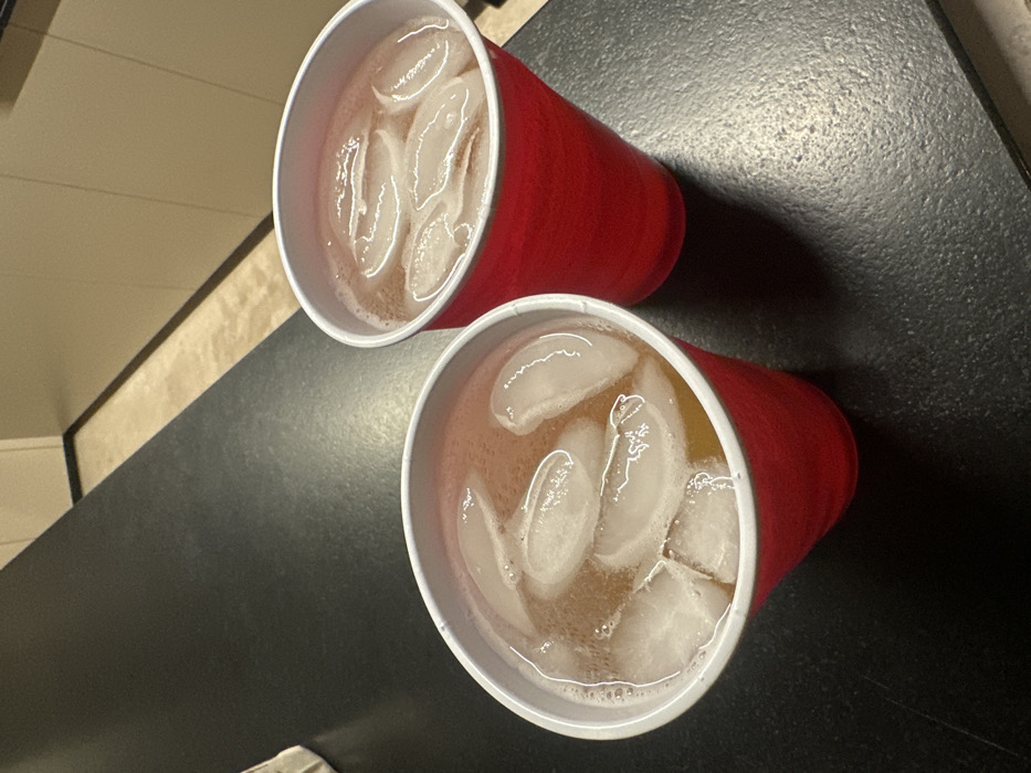 The scene is set indoors in Monterrey, Mexico. Two red plastic cups, each with a white interior, are positioned on a dark, textured countertop. Both cups contain a light amber-colored liquid with multiple irregular-shaped ice cubes, approximately seven to nine per cup, floating at the surface. Bubbles are visible within the liquid, indicating effervescence. The countertop occupies the foreground and mid-ground. In the background, a light-colored floor with a dark dividing line is visible, adjacent to light beige or tan cabinetry/walls. No individuals, actions, or direct interactions are visible within the frame.