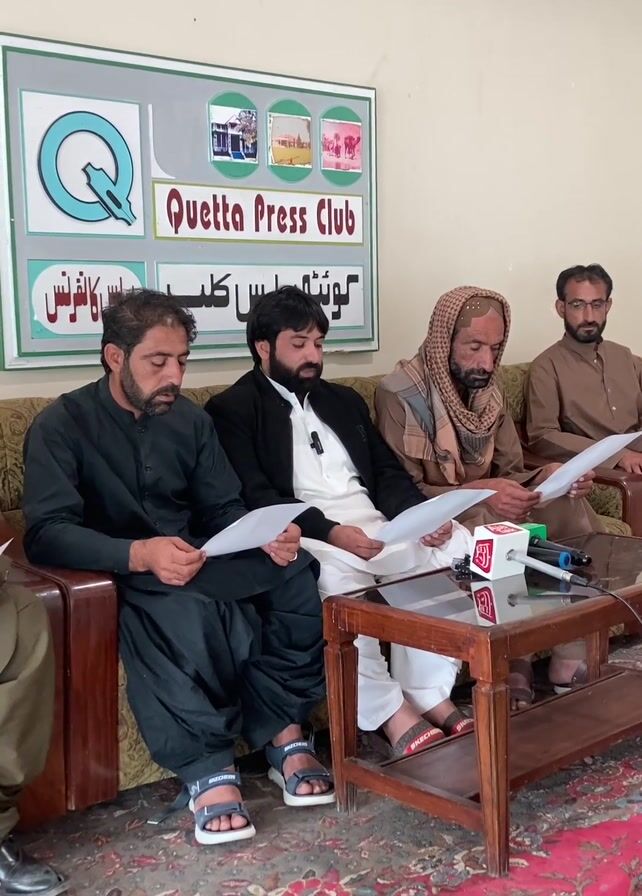 Four men are seated on a brown couch in front of a table with microphones on it. Each man is holding and reading from a piece of paper. A sign on the wall behind them reads "Quetta Press Club" in English and another language. The man on the left is wearing a black shalwar kameez and sandals. The second man from the left is wearing a black coat over a white shirt and shalwar kameez. He is also wearing sandals. The third man is wearing a tan shawl wrapped around his head and a white shalwar kameez. He is also wearing sandals. The man on the right is wearing a brown shirt and has a beard and glasses. The table in front of them is made of wood and has a shelf underneath. There is a red and black rug on the floor.