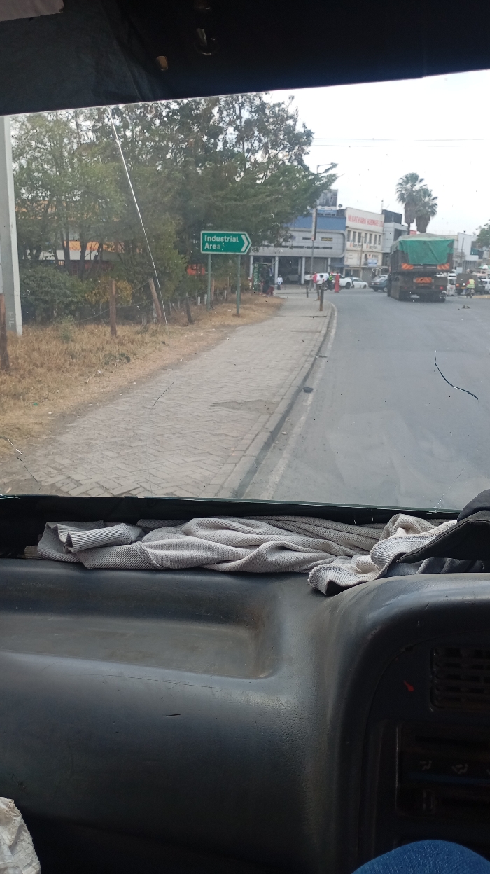 A view from inside a vehicle reveals a street scene. A green sign indicates "Industrial Area" with a left arrow. Buildings line the opposite side of the street, with various vehicles and pedestrians visible. A large truck with a green tarp occupies the right lane. The vehicle's dashboard is prominent in the foreground, covered with a gray cloth. A crack is visible on the windshield.
