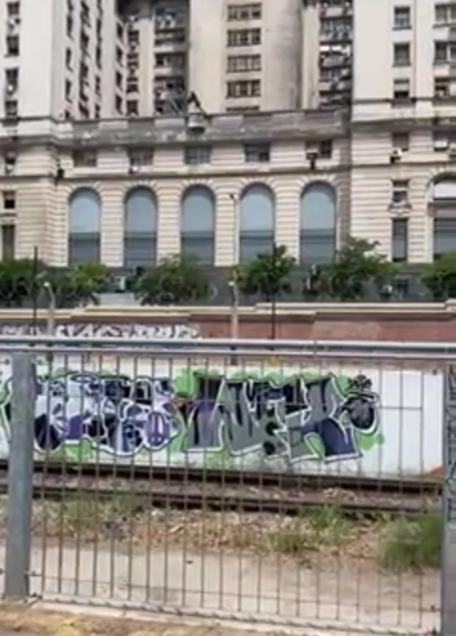 The camera is stationary, framing a scene with a mixture of urban elements. In the foreground, there's a metal fence running parallel to the camera, with graffiti art visible behind it on a wall. The graffiti consists of letters in shades of purple, grey, and green. Just behind the wall are train tracks running parallel with it, with some vegetation growing in the area. In the background, a large, multi-story building with multiple windows and air conditioning units is visible. The building has a classical architectural style with a facade in light colors and arches. The sky is not visible, but the overall lighting suggests it's daytime. There are no people visible in the shot.