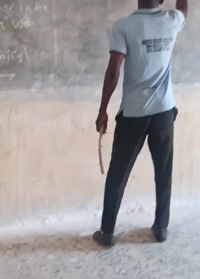 man, from the back view and then turning to face the camera, standing in front of a chalkboard in what appears to be a classroom