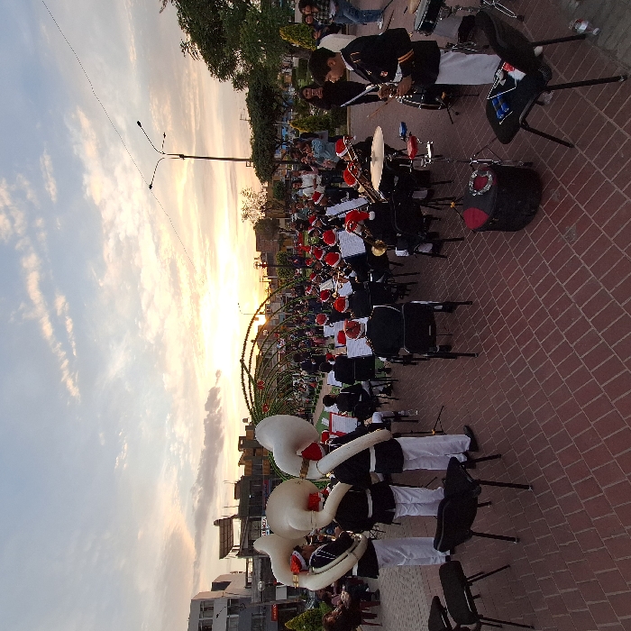 A marching band is performing outside, possibly during the holiday season as many members are wearing Santa hats. The band is lined up on a brick path under a decorative archway. Instruments visible include tubas, trumpets, and drums. Some people are watching the performance from the side. The sky is bright with the setting sun, and buildings can be seen in the background.