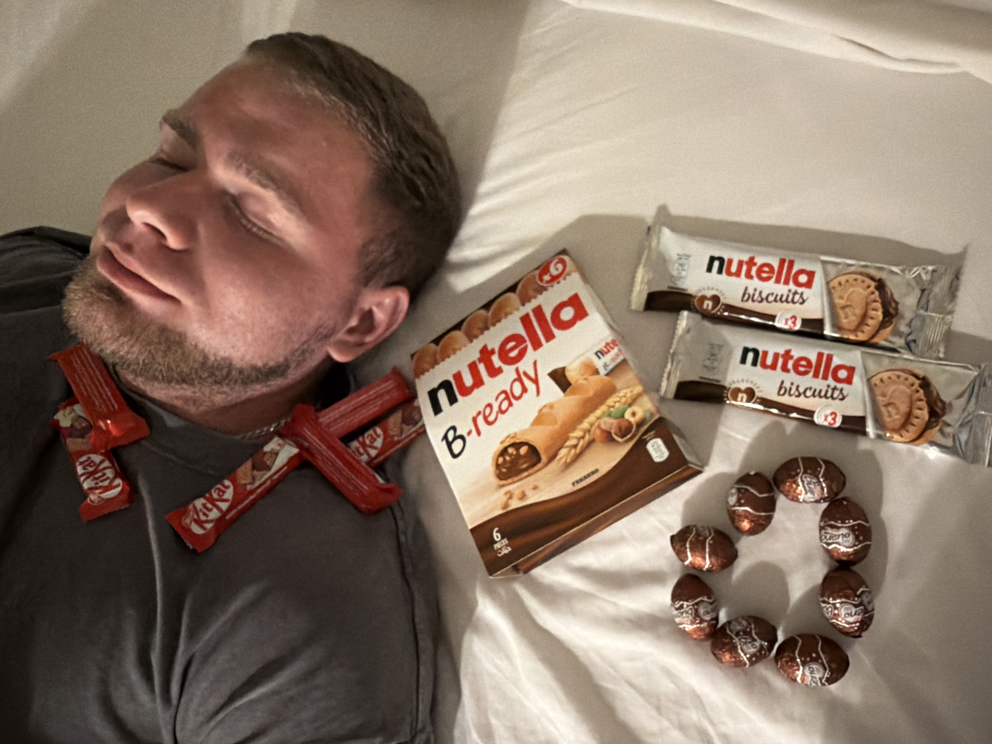 A man with a beard is sleeping on a white bed. Around his neck is a necklace made of Kit Kat candy bars. Next to him is a box of Nutella B-Ready snacks, two packages of Nutella biscuits, and eight individually wrapped Kinder Bueno eggs arranged in a circle. The location is not discernible from the image.
