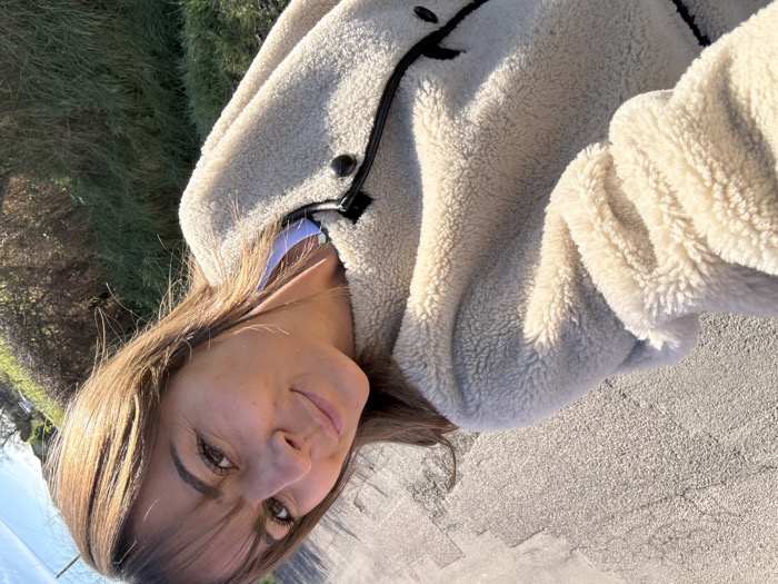 A female individual is depicted in a high-angle outdoor portrait, appearing to be a selfie. She has medium-length brown hair with bangs and is looking directly at the camera with a faint smile. She wears a cream-colored, textured sherpa-style jacket featuring black trim along the front opening and two visible black buttons. A white collar or undershirt is visible beneath the jacket. The scene is illuminated by strong natural sunlight, creating visible shadows and highlights. The background on the left consists of a grey, textured paved surface with visible cracks, resembling a sidewalk or path. The background on the right features green and dry grass, suggesting a natural verge, with sparse shrubbery and a clear blue sky visible in the distance. The setting is an outdoor, possibly rural or suburban environment in Veauche, France.