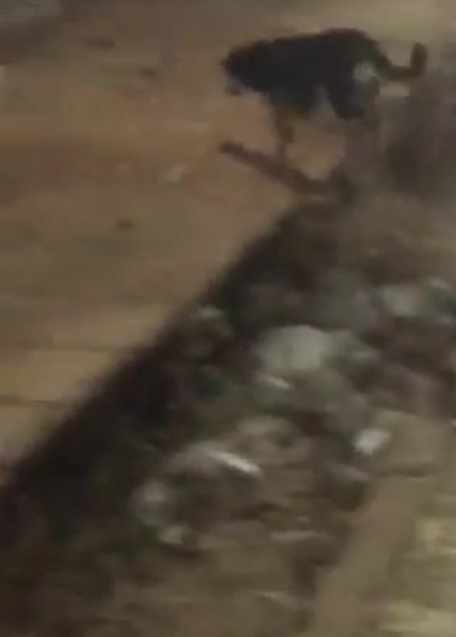 At night, a dog is seen standing at the edge of a paved road and then walking away from the camera. The road is cracked and broken. There is trash and debris visible along the side of the road. The video is grainy and the lighting is poor. There is a light pole visible at the beginning of the video. An air horn sound is heard in the background. The dog walks across a dirt area adjacent to the road.