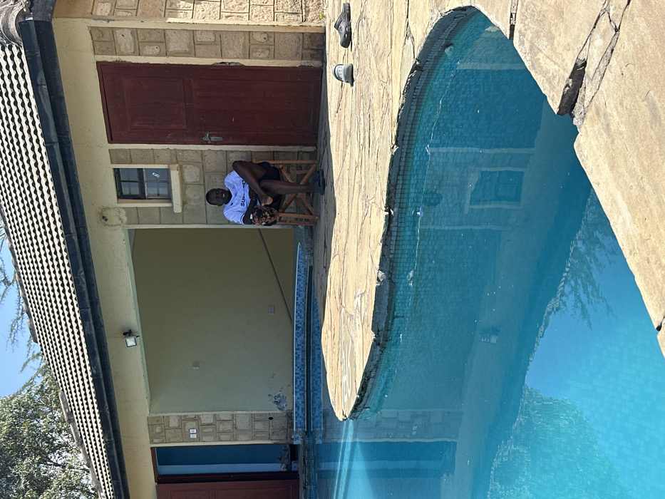 The image depicts an outdoor scene in Olkaria ward, Kenya, featuring a single adult male positioned beside a swimming pool, in front of a single-story building