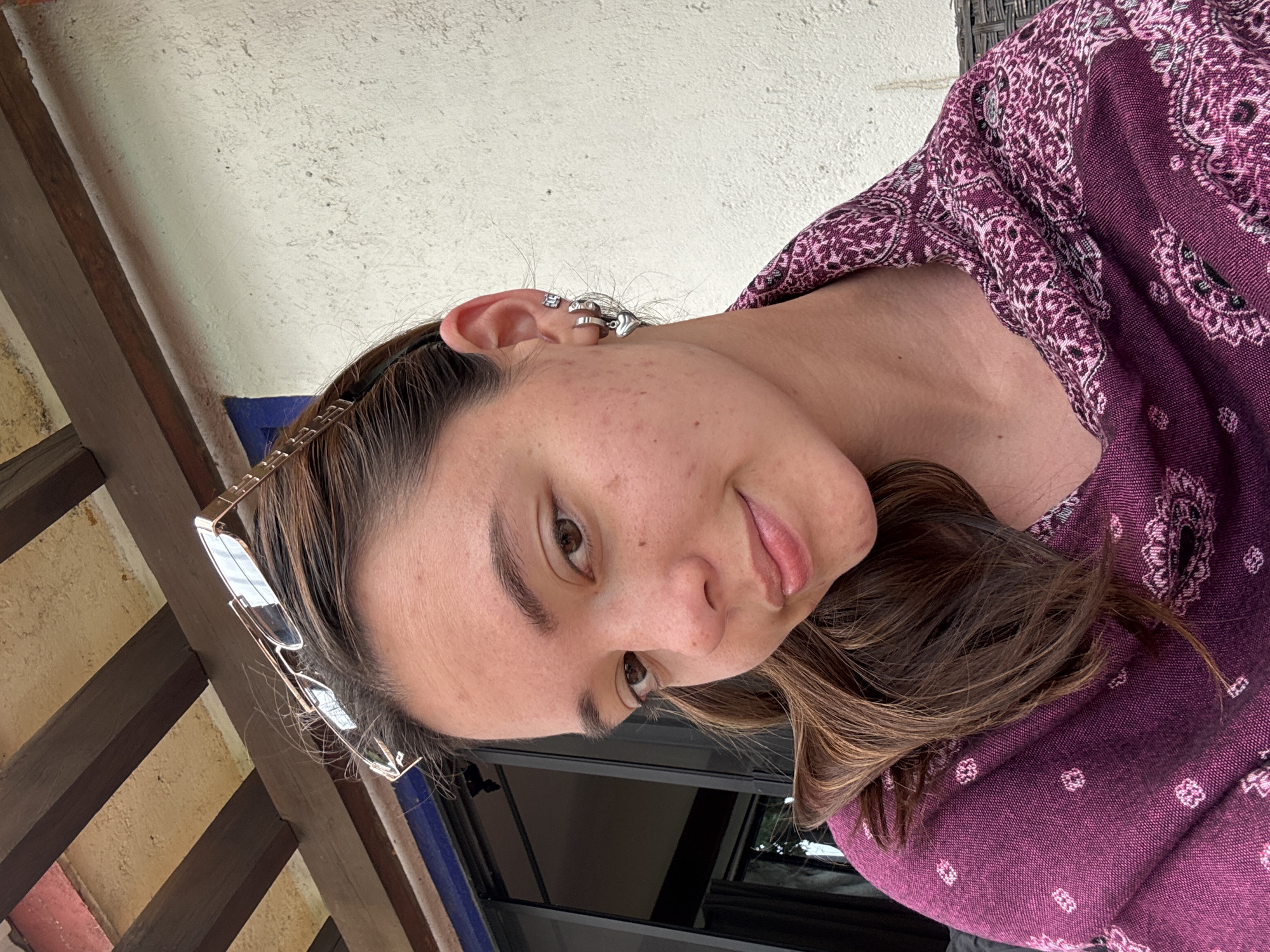 A woman with brown hair, wearing a purple patterned shirt and several earrings in her left ear, is pictured indoors with a window behind her