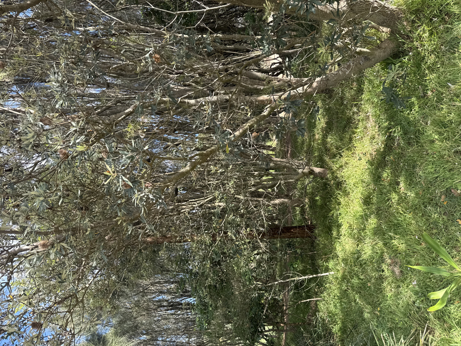A row of trees lines a grassy area. The trees have dense branches and foliage with some brown, cylindrical seed pods visible. The grass is a vibrant green and appears thick. The trees create a tunnel-like effect due to their proximity and the dense foliage overhead.