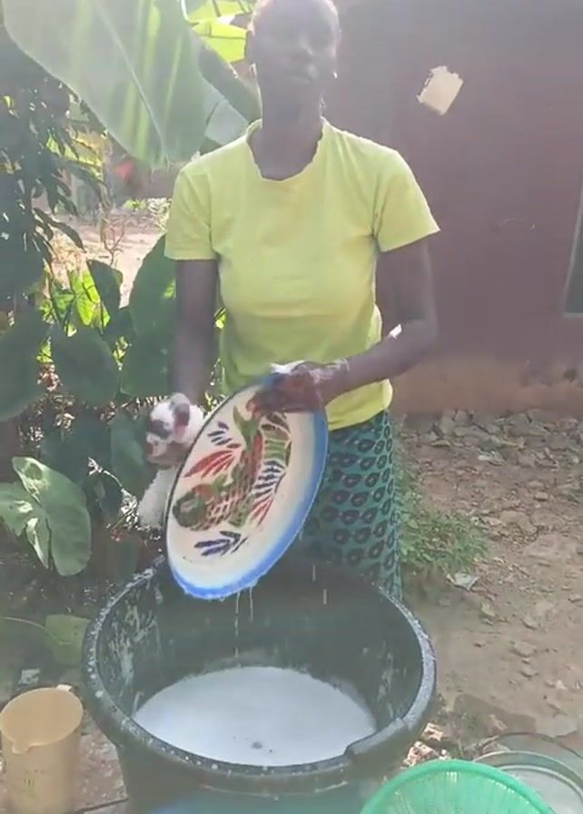 A woman is washing dishes in a black bucket filled with soapy water. She is wearing a lime green shirt and a green patterned skirt. She lifts a plate with a blue rim and a painted fish design from the bucket, displaying it before putting it back in the water. The scene takes place outdoors in a yard with a banana tree and a building in the background. Other items, including a yellow cup and a green basket, are visible around the bucket.