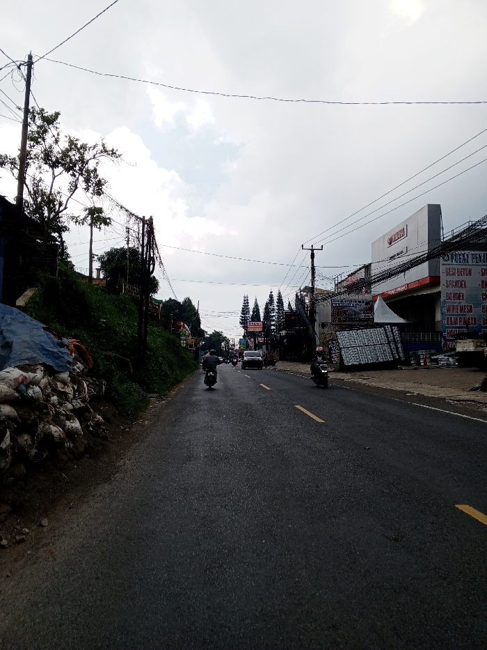 The image, captured in Multhan, India, depicts a two-lane asphalt road under an overcast sky