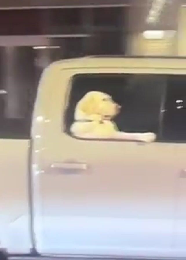 side of a white pickup truck driving at night. A yellow Labrador dog is sitting in the passenger seat, its front paw resting on the window sill. Traffic and street lights pass in the background.