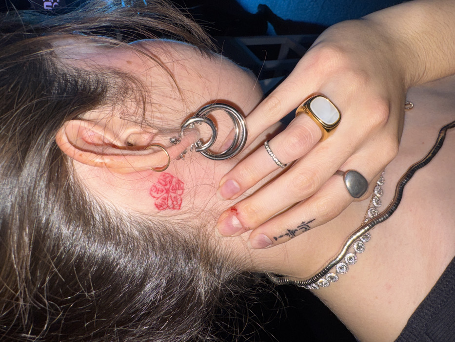 A person's head and hand are visible. The ear is pierced multiple times with various rings. A red floral tattoo is near the ear. The hand wears a large gold ring with a white stone, a thin diamond ring, and a silver ring. A tattoo is on the finger. A snake chain and a diamond tennis necklace are visible. The person has dark hair.