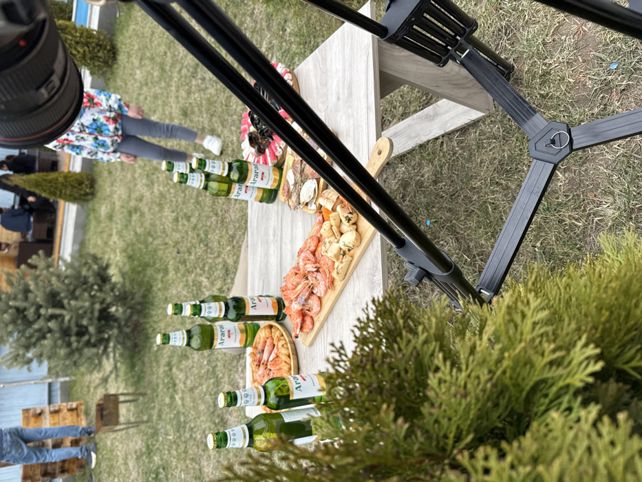 This image depicts an outdoor gathering scene in Voskevaz, Armenia. In the immediate foreground, the black legs and upper structure of a camera tripod are prominently visible, partially obscuring the view. To the left, a dense, green evergreen shrub occupies a portion of the frame. The midground is dominated by a light-colored wooden picnic table, situated on a grassy lawn. On the table, eight green glass bottles of "Ararat" brand beer with white labels are arranged. Three wooden serving boards are present: one holds a large quantity of cooked, shelled shrimp; another displays cooked scallops and small bread pieces; and a round platter with a red rim contains various dark-colored appetizers. In the background, a grassy area extends further. To the right of the table, a person stands, facing away from the camera, wearing a white floral-patterned jacket, grey pants, and white shoes. Further back, a group of individuals is seated on dark outdoor furniture, including chairs and a sofa, positioned next to a light-colored wooden building with blue trim. These individuals are partially obscured. To the far left of the scene, a person in blue jeans stands near a small, square metal barbecue grill. Two evergreen trees are visible in the background, flanking the seated group. The environment is casual, suggesting a leisurely outdoor meal or event.