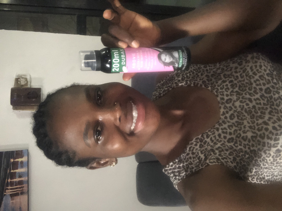 An adult female, appearing to be of African descent, is depicted indoors in Langbasa, Nigeria, facing the camera with a broad smile. Her dark hair is styled in cornrows or braids receding from the forehead. She wears small gold-colored hoop earrings and a nose piercing on her right nostril. Her attire consists of a sleeveless top featuring a light brown and dark brown leopard print. She holds a pink and black 200ml "DUBAS ABOVE ULTRA HOLD" aerosol can in her right hand, positioned prominently towards the viewer. The can's label displays text including "SINCE 2003" and "WITH EXTRA CONDITION," alongside a small image of a woman's face. The background consists of a light-colored wall, featuring a horizontal landscape painting or print in dark and light tones. To the upper right, a dark brown electrical switch or outlet cover with a circular knob is visible, next to a lighter-colored rectangular electrical component. A portion of a dark-colored chair or couch is visible behind her left shoulder.
