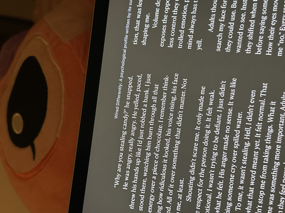 The image displays a close-up, oblique view of a digital screen positioned in the foreground, with a plush toy partially visible behind it in the upper portion. The screen, likely from a tablet or laptop, shows white text on a dark gray background, arranged in columns. The visible title reads "Wired Differently: A psychological profile written by its su..." followed by narrative text beginning with a quote: "\"Why are you stealing candy?\" he snapped. He was angry, really angry." The text describes a confrontational interaction and the narrator's internal reflections. Behind the screen, the plush toy presents an orange fabric surface with a large, black, oval-shaped eye featuring a prominent white highlight or reflection. Stitching defines areas around the eye, suggesting an eyelid or brow. The texture of the plush toy appears soft. The scene is illuminated by the screen's light, with ambient light levels appearing low. No individuals are directly depicted. The specific city of Pernik, Bulgaria, is not determinable from the visual evidence presented in the image.