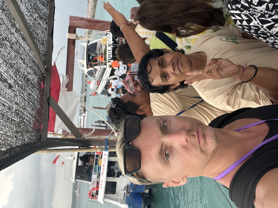 The image depicts a crowded maritime boarding area or pier in Toyapakeh, Indonesia, under an overcast sky. In the foreground, a fair-skinned male with short blonde hair and sunglasses positioned on his head, wearing a black tank top and purple lanyard, looks directly at the camera. To his immediate right, an Asian male with dark wavy hair, wearing a tan t-shirt with a green logo and bracelets on his right wrist, displays a peace sign with his right hand while also looking at the camera. Numerous other individuals, predominantly of Asian descent, are visible in the mid-ground and background, some partially obscured, appearing to be passengers or crew. One person's arm is raised in the distance. An overhead structure, possibly a canopy, features black mesh netting and a torn red and white Indonesian flag. The scene is set on turquoise water, where two prominent white passenger boats are visible. To the left, a boat labeled "The Angkal 2" is docked or moored, flying an Indonesian flag. To the right, another boat, partially labeled "JOGLA Exp" (likely "Jogla Express"), shows multiple individuals, some wearing orange life jackets, actively boarding or disembarking. Additional boats are present in the distant background, with a breakwater visible further along the coastline.