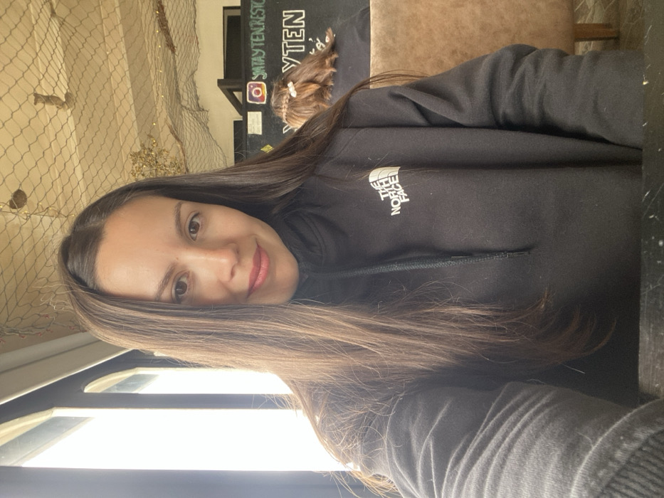 The image captures a female individual seated indoors at what appears to be a restaurant in Puerto Almanza, Argentina. The woman, estimated to be in her late 20s to early 30s, possesses long, straight dark brown hair, light brown eyes, and pink-toned lips, and is looking directly at the camera with a slight smile. She is wearing a black hooded sweatshirt with a zipper and drawstring, featuring the white "THE NORTH FACE" logo on the left chest. She is positioned behind a dark, reflective surface, likely a table. To her left, a large window with vertical dark frames allows significant natural light to enter. The background to her right reveals a commercial interior. A dark wall or signboard displays the text "@SANTAYTENRESTO" next to an Instagram logo, identifying the establishment as "Santa Y Ten". Below this, "YTEN" is partially visible in larger white text. Another individual is seated further back, visible from behind, with brown hair styled in a braid adorned with small white beads or clips. A light brown, upholstered booth or chair is visible behind this second person. The ceiling is covered with a light-colored decorative fishing net, consistent with a nautical or rustic theme, from which several small, indistinct objects are suspended. The specific identification of "Santa Y Ten" confirms the location within Puerto Almanza, Argentina.