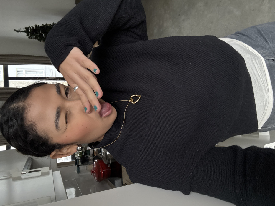 A female individual of apparent young adult age is depicted in a selfie-style, waist-up portrait taken indoors in Antwerp, Belgium. The subject has dark hair styled in braids, winks with her right eye, and extends her tongue. Her right hand, featuring teal nail polish and a silver band ring on the ring finger, is positioned across her lower face, obscuring the nose and upper lip. She wears a black, textured, long-sleeved mock-neck top, a gold-colored chain necklace with a textured heart-shaped pendant, a light-colored undershirt, and blue-grey pants. A silver stud earring is visible in her left ear. The background shows a residential interior: a kitchen area on the left with white overhead cabinets, a black stovetop featuring a red lidded pot, and various kitchen items. To the right, a window with dark curtains reveals an exterior light-colored building with rectangular windows. A small, dark green artificial Christmas tree stands near the window. The floor is a light-toned, possibly concrete or tiled surface.
