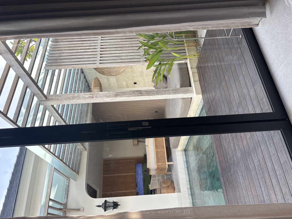 The image displays an outdoor and indoor villa area in Kerobokan, Indonesia, viewed through a partially open black-framed glass sliding door