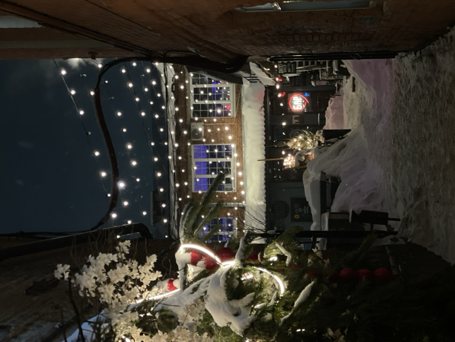 A narrow alleyway is decorated with strings of lights. A brick building stands to the left, its windows illuminated with a blue hue. To the right, snow lines the path. Christmas decorations, including a lit-up tree, are in the foreground. Further down the alley, a sign reading "BAR" in Cyrillic letters indicates an establishment. The scene conveys a festive, wintry atmosphere.
