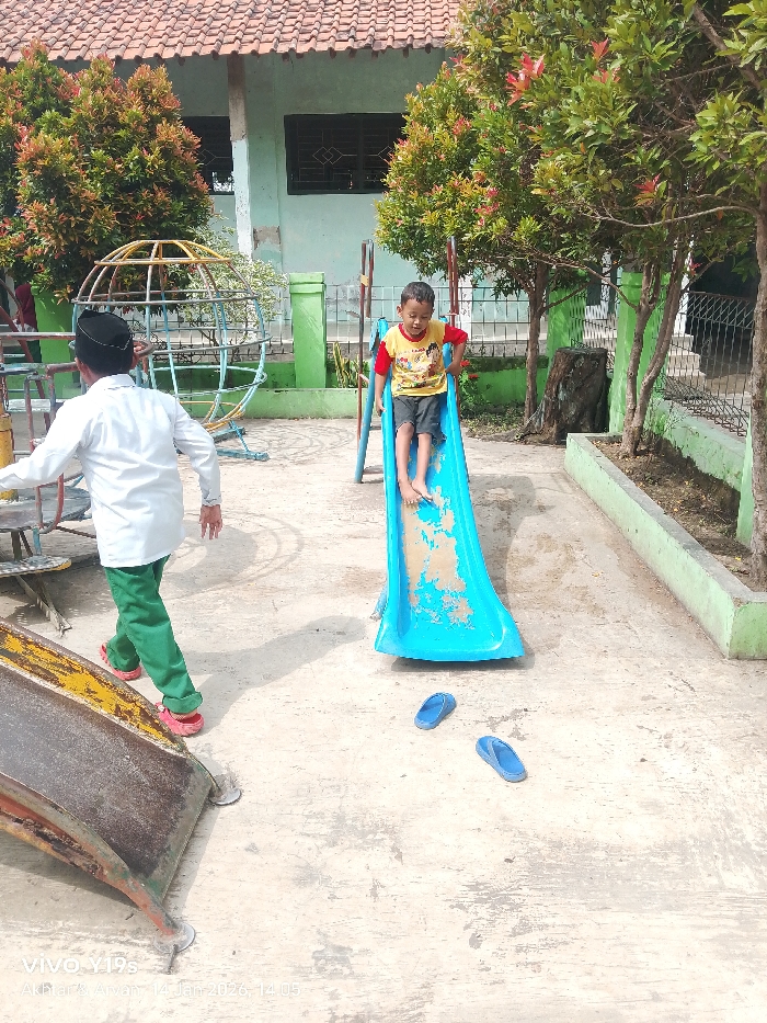 - "A child in a yellow and red shirt is sliding down a blue slide in a playground" by FM-bXIMf1, licensed under CC BY 4.0